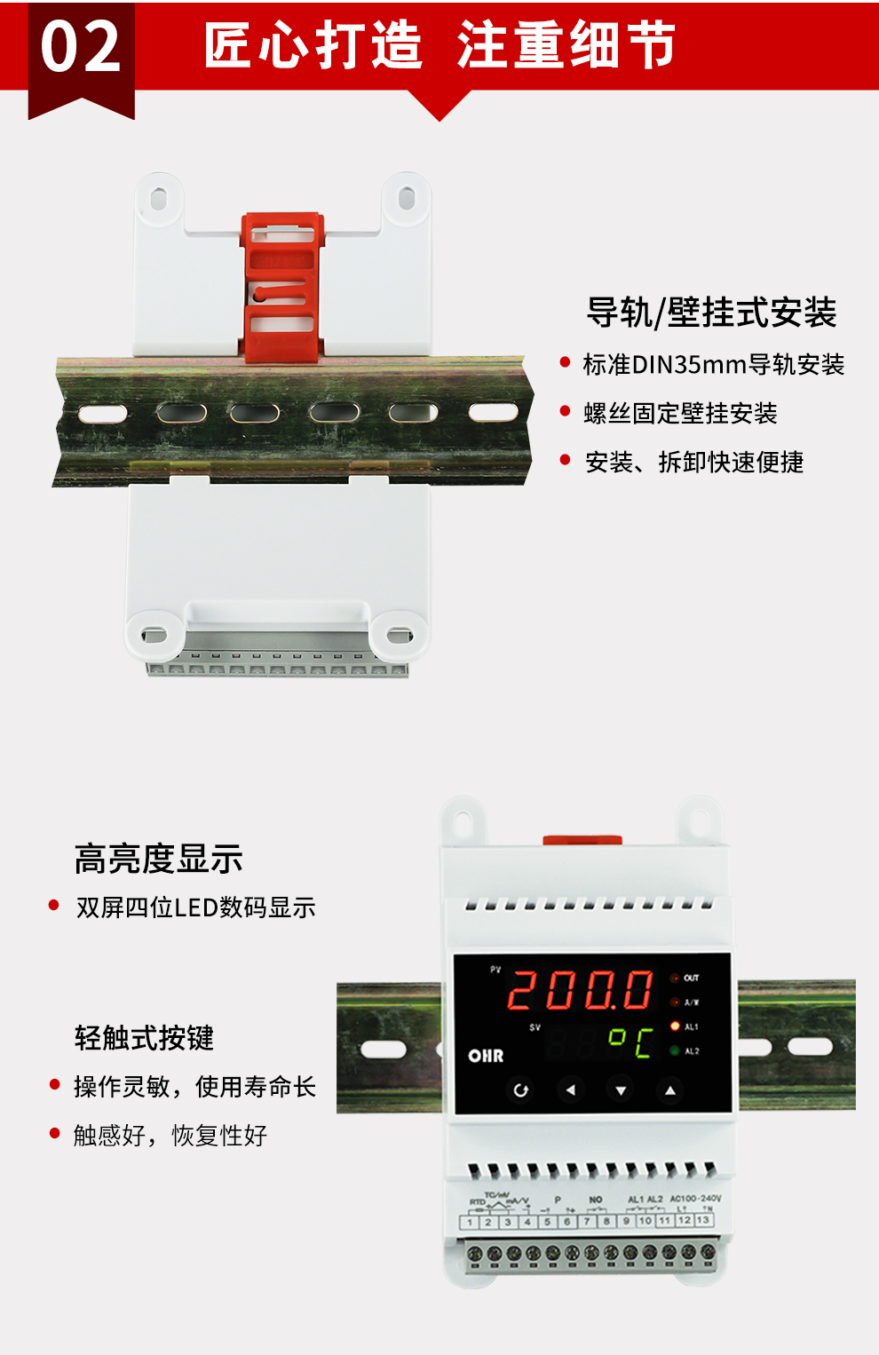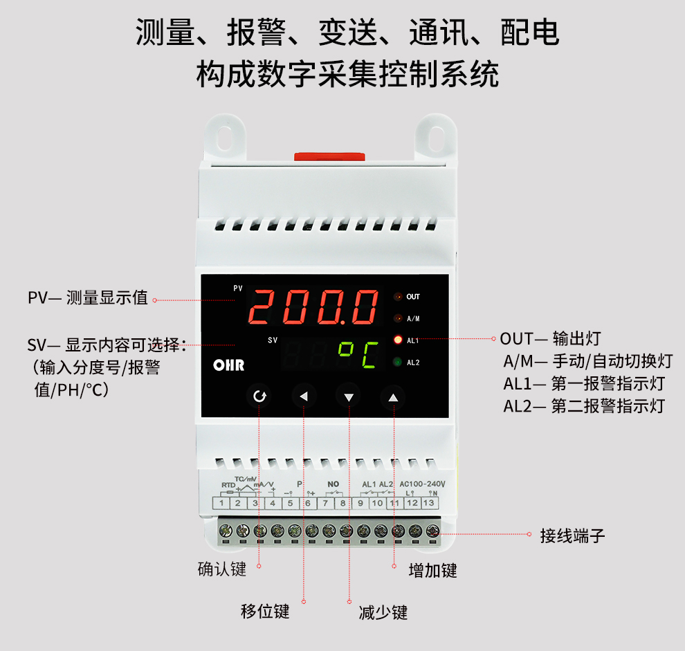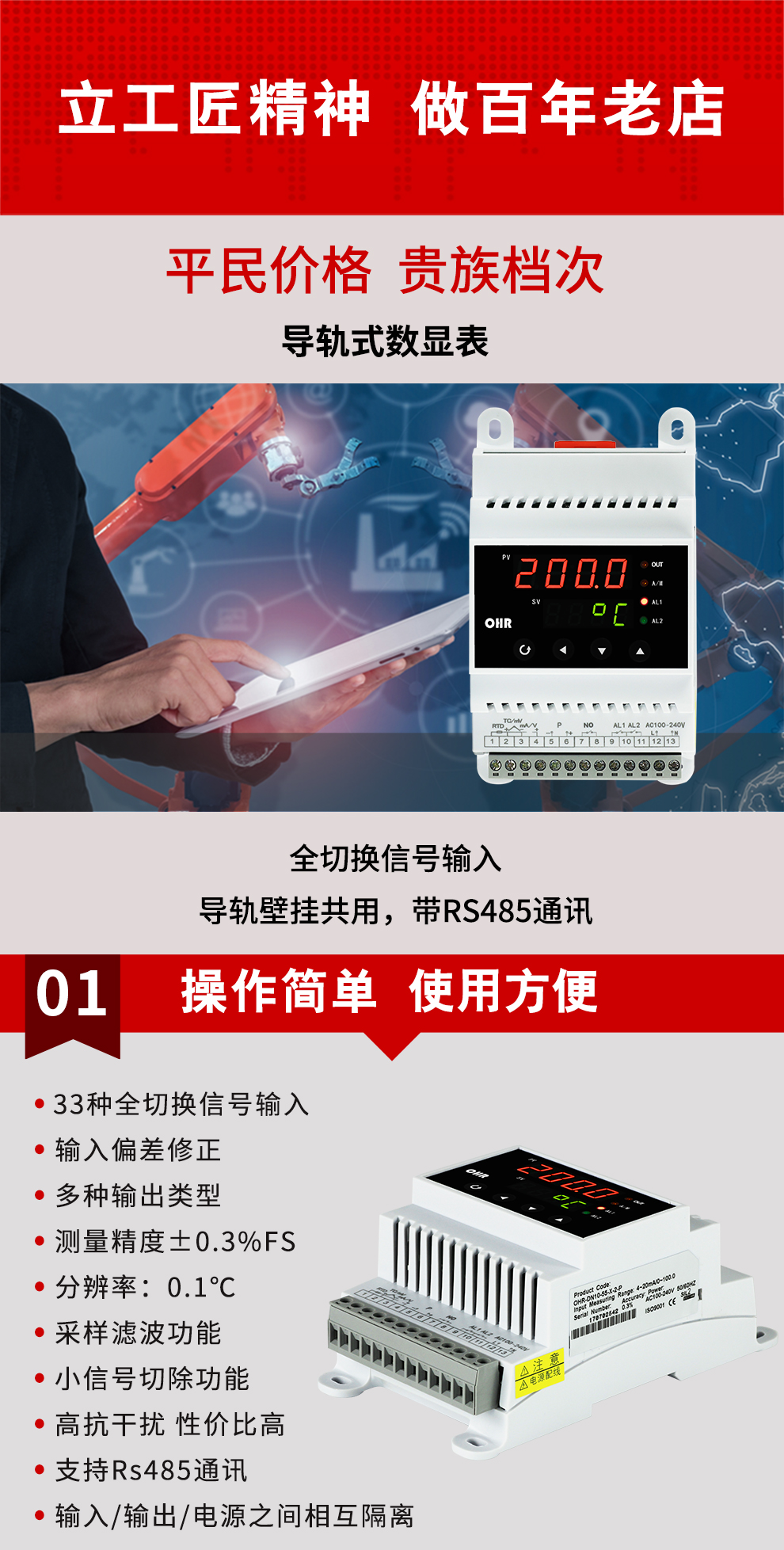 • 導軌式數字顯示控制儀采用了表面貼裝工藝,全自動貼片機生產,具有很強的抗干擾能力。可對溫度、壓力、液位等工業過程參數進行測量、顯示、報警控制、變送輸出、數據采集及通訊。