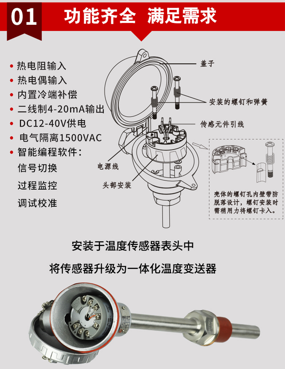 溫度變送器將現(xiàn)場(chǎng)的熱電阻或熱電偶等溫度傳感器信號(hào)經(jīng)過(guò)隔離放大處理,轉(zhuǎn)換為與溫度成線性的二線制4-20mA信號(hào)輸出至控制系統(tǒng)。