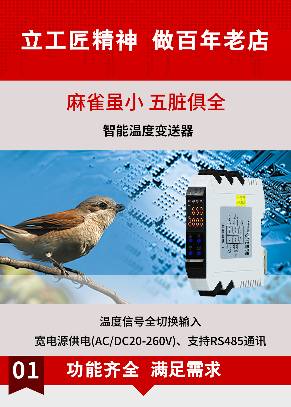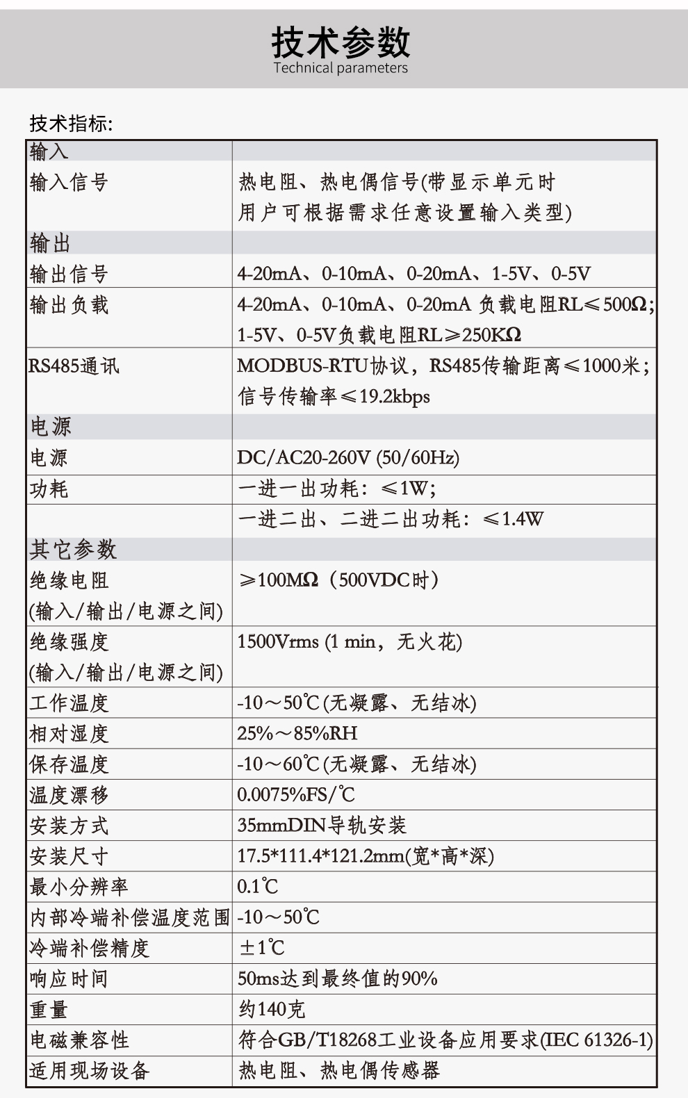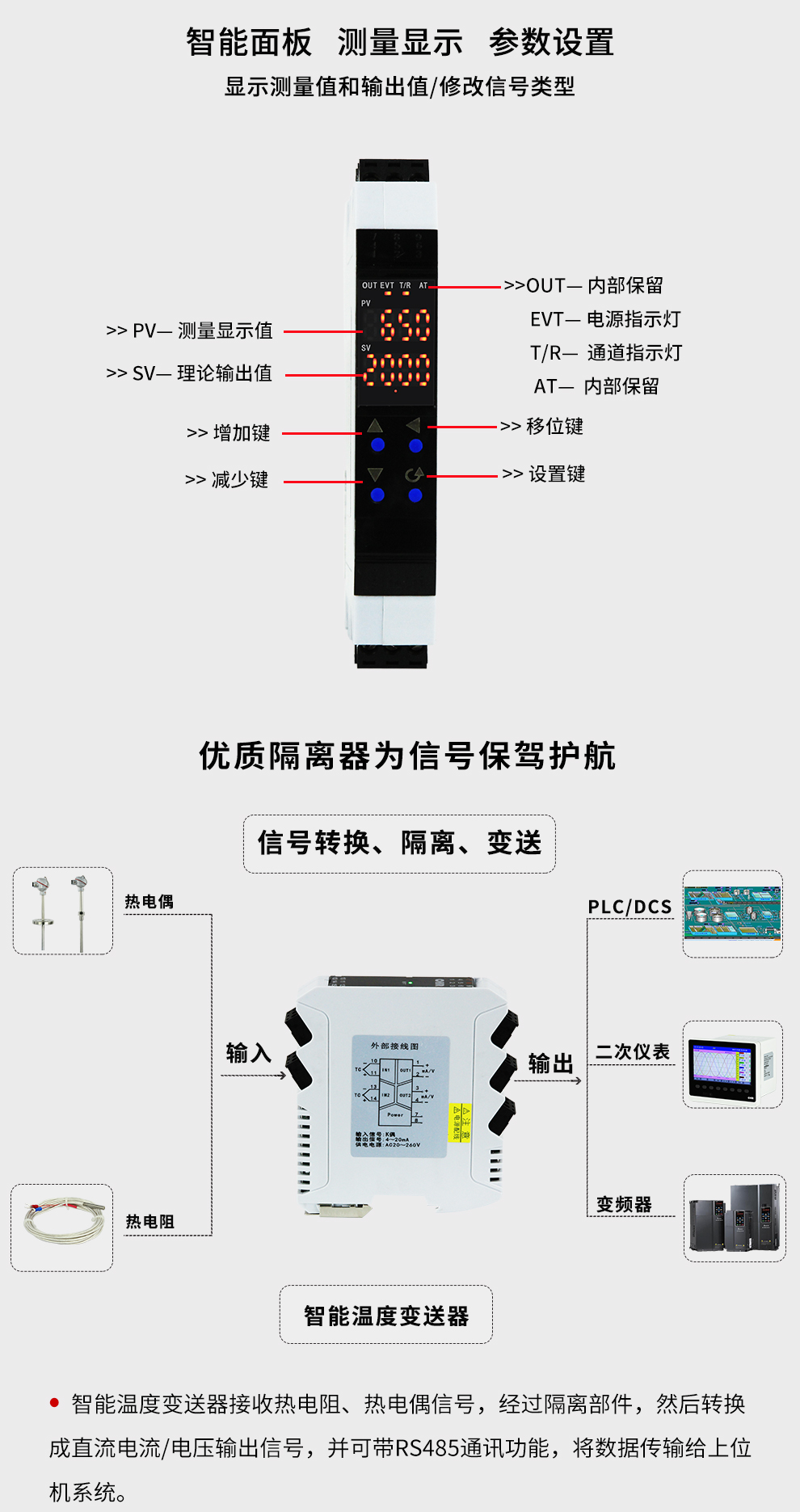 • 溫度變送器將現(xiàn)場的熱電阻或熱電偶等溫度傳感器信號經(jīng)過隔離放大處理,轉(zhuǎn)換為與溫度成線性的二線制4-20mA信號輸出至控制系統(tǒng)。