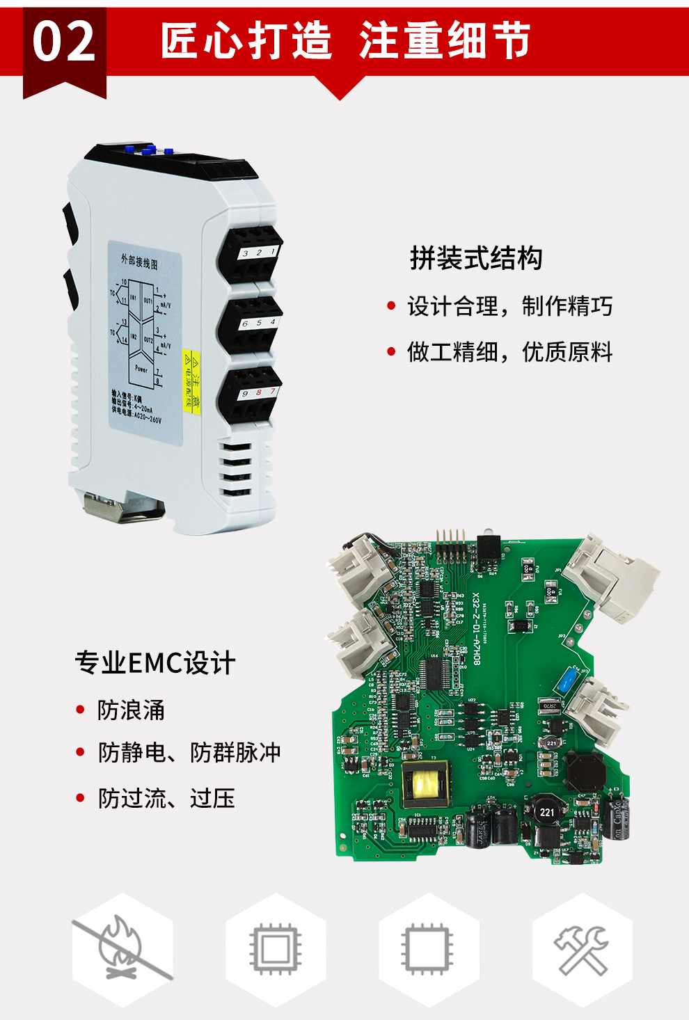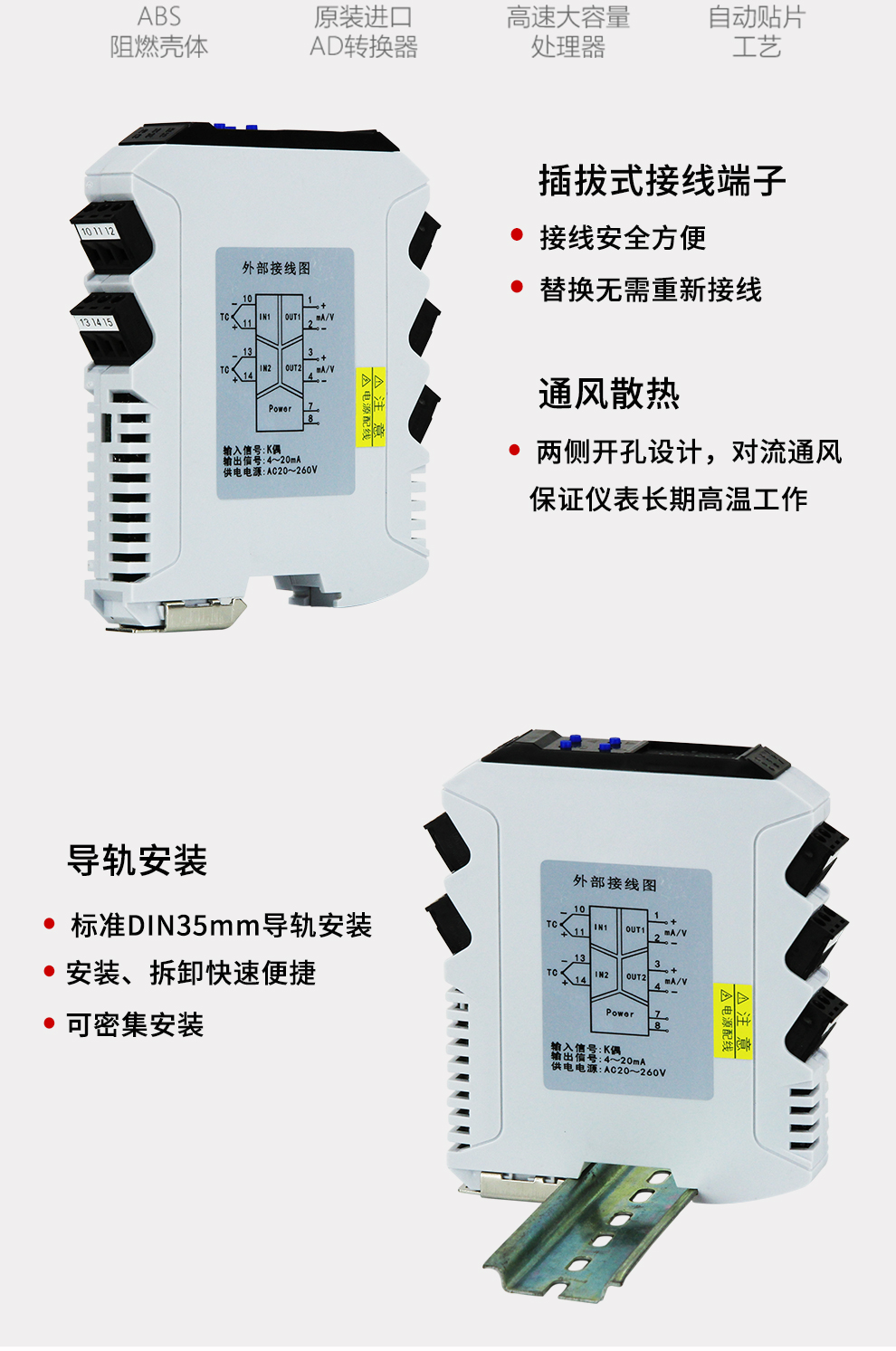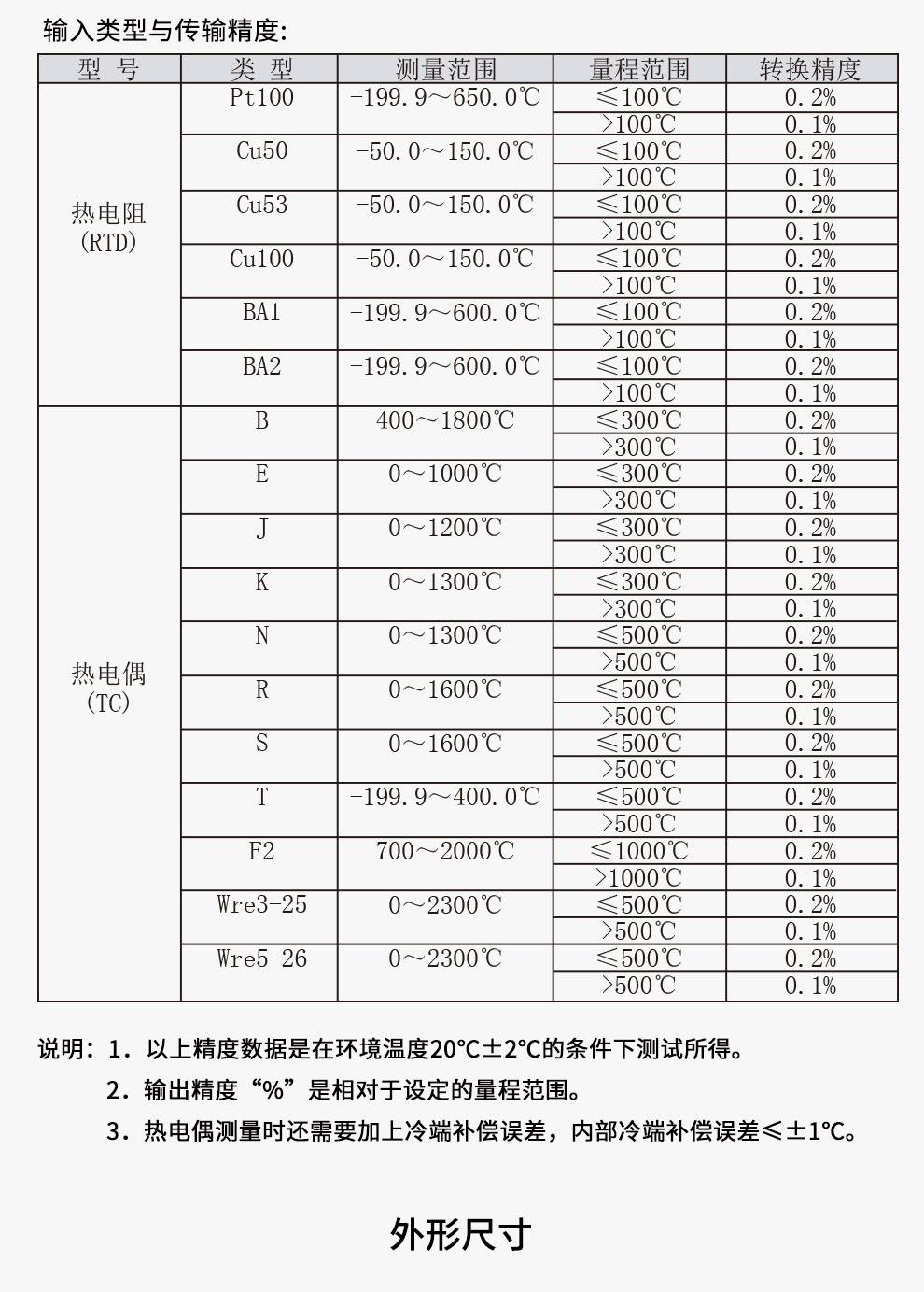 • 溫度變送器將現(xiàn)場的熱電阻或熱電偶等溫度傳感器信號經(jīng)過隔離放大處理,轉(zhuǎn)換為與溫度成線性的二線制4-20mA信號輸出至控制系統(tǒng)。