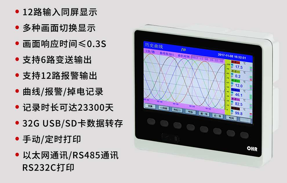 • 彩色無紙記錄儀/溫度記錄儀采用新型大規(guī)模集成電路,對輸入、輸出、電源、信號采取可靠保護(hù)和強(qiáng)抗干擾設(shè)計。機(jī)身短節(jié)約空間,深度僅為76mm。12路萬能信號輸入,可帶12路報警輸出,6個變送輸出,RS485通訊接口,以太網(wǎng)接口,微型打印機(jī)接口和USB接口,SD卡插座。