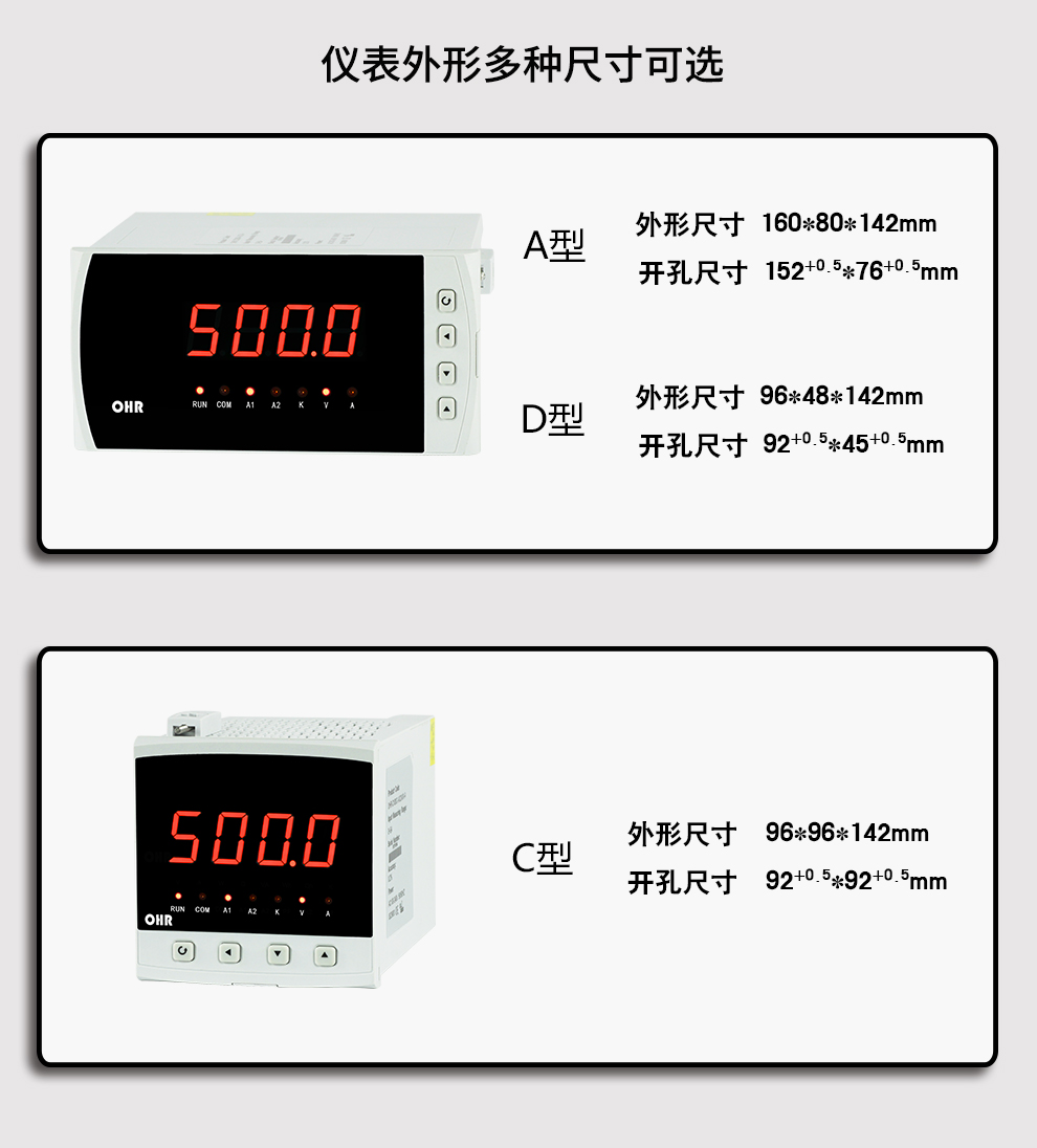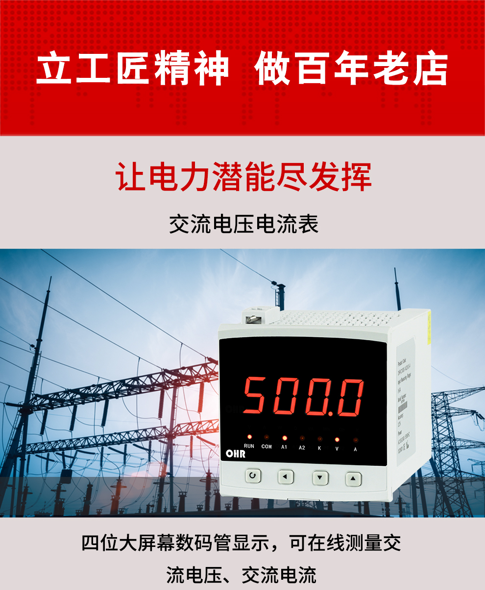 • OHR-C200系列交流電壓/電流表為新 一代可編程智能儀表,它采用大規模集成電路,應用數字采樣技術,對單相電氣線路中的電壓、電流進行實時測量、顯示和控制,并通過RS485接口或模擬量變送輸出接口對被測量電量數據進行遠傳。