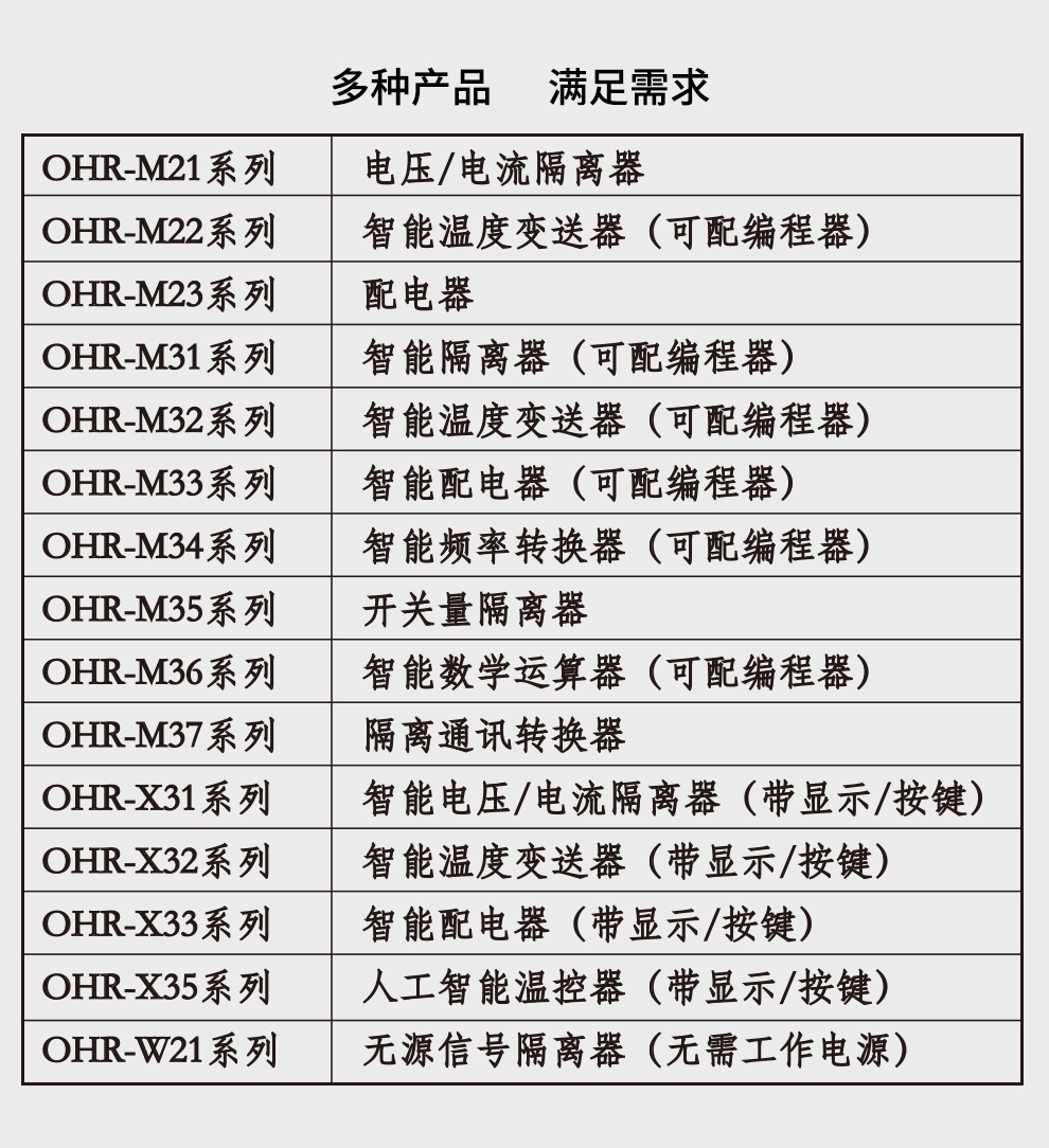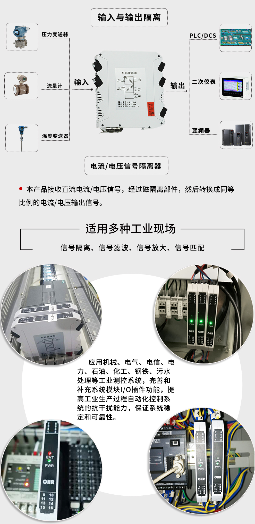 • OHR-M21系列電壓/電流隔離器將直流電壓或電流信號(hào)經(jīng)過隔離傳送,轉(zhuǎn)換成所需的信號(hào)給其它儀表。可以與單元組合儀表及DCS、PLC等系統(tǒng)配套使用,給予現(xiàn)場(chǎng)儀表信號(hào)隔離、信號(hào)轉(zhuǎn)換、信號(hào)分配、信號(hào)處理等,從而提高工業(yè)生產(chǎn)過程自動(dòng)控制系統(tǒng)的抗干擾能力,保證系統(tǒng)的穩(wěn)定性和可靠性。